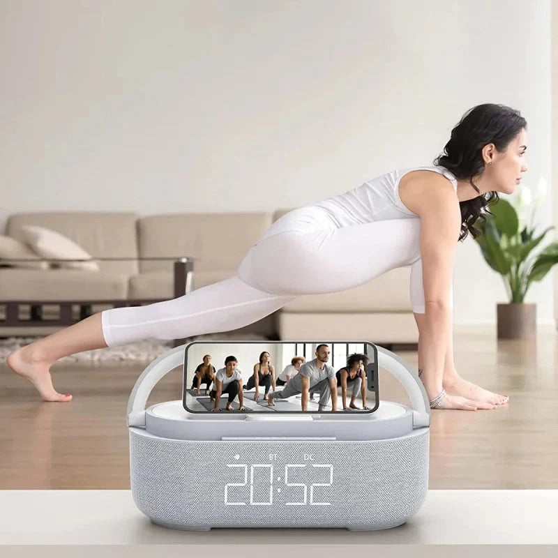 Imagina despertar suavemente, con la luz cálida de tu nueva radio despertador lámpara con cargador que imita el amanecer. Este innovador dispositivo no es solo un reloj; es tu compañero ideal para empezar el día con energía y tranquilidad. Olvídate de los cables enredados en tu mesita de noche, ya que su base de carga inalámbrica te permite cargar tu smartphone sin esfuerzo mientras duermes o te preparas para salir. Con un diseño elegante que combina la madera clara y una tela acústica, se integra perfectamente en cualquier decoración moderna.
