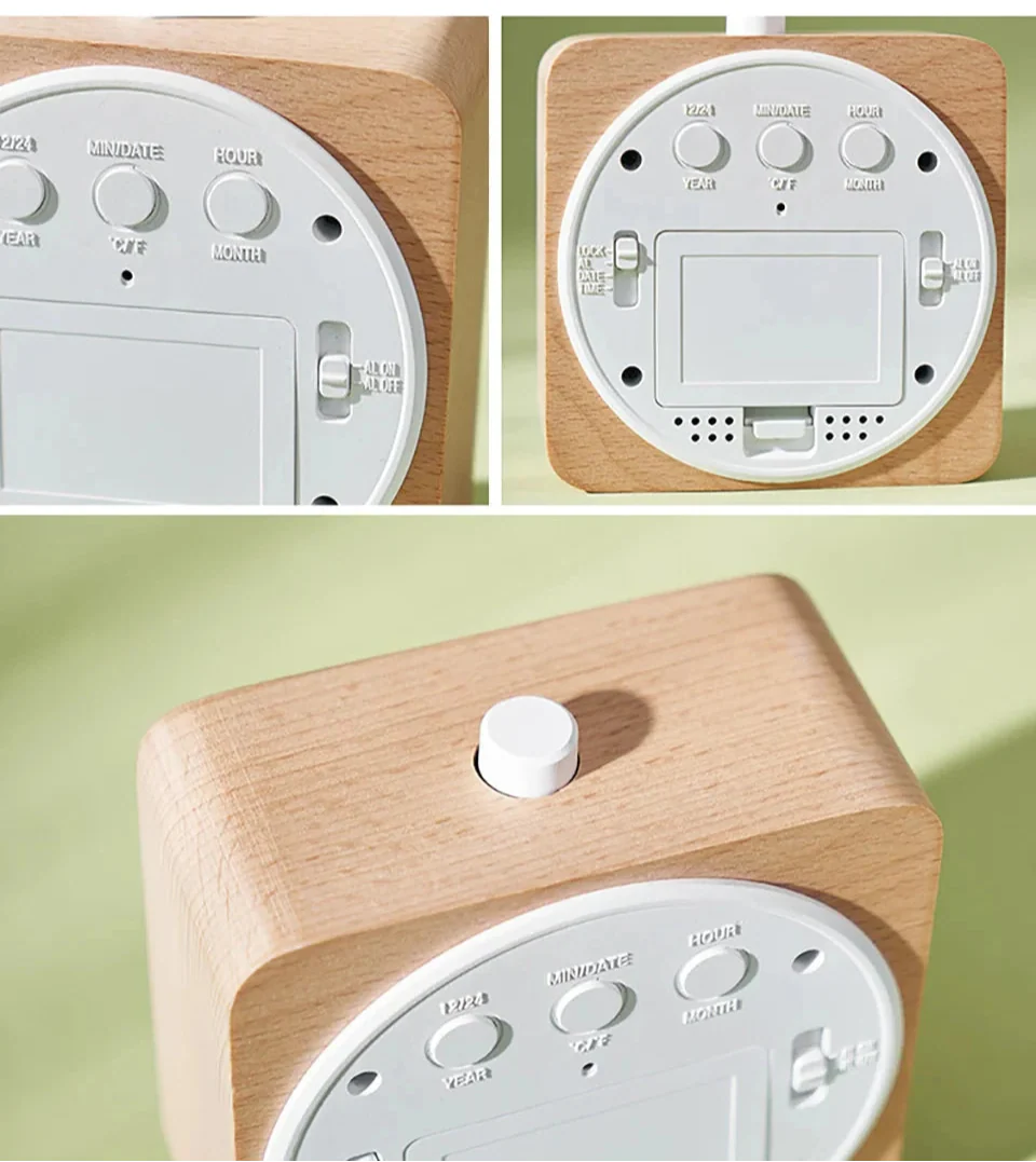 Este despertador ha sido diseñado pensando en tu comodidad. Su pantalla digital clara muestra la hora en grande, así como la fecha y la temperatura ambiente, todo de un vistazo. La imitación de madera no solo le da un aspecto sofisticado, sino que también lo hace sentir más cálido y orgánico que los típicos despertadores de plástico. Es la combinación perfecta de tecnología y naturaleza, creando un ambiente relajante y funcional en tu hogar.